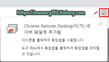 'Chrome Remote Desktop(크롬 원격 데스크톱)' 확장 프로그램 설치가 완료되면, 이렇게 우측 상단에 이러한 확장 프로그램이 추가됩니다.