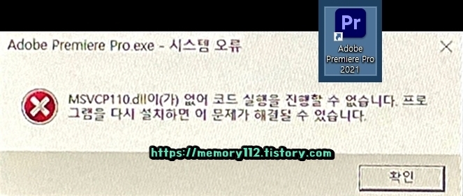 MSVCP110.dll(MSVCR110.dll) 오류는 동영상 편집 프로그램인 프리미어 프로를 실행할 때 나타나며, 오류 내용은 "MSVCP110.dll이(가) 없어 코드 실행을 진행할 수 없습니다. 프로그램을 다시 설치하면 이 문제가 해결될 수 있습니다."입니다.