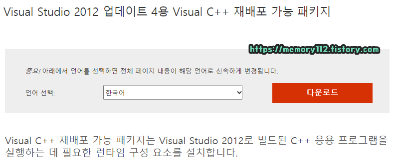 Download Visual Studio 2012 업데이트 4용 Visual C++ 재배포 가능 패키지 from Official Microsoft Download Center