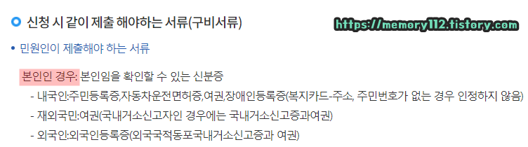 추가로 재외국민인 경우에는 '여권', 외국인인 경우에는 '외국인등록증'이 필요합니다.