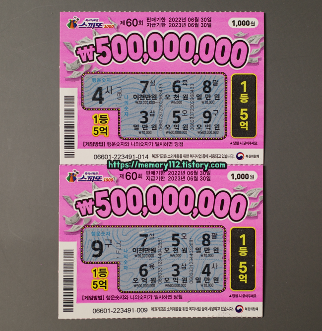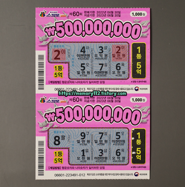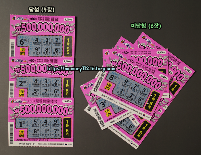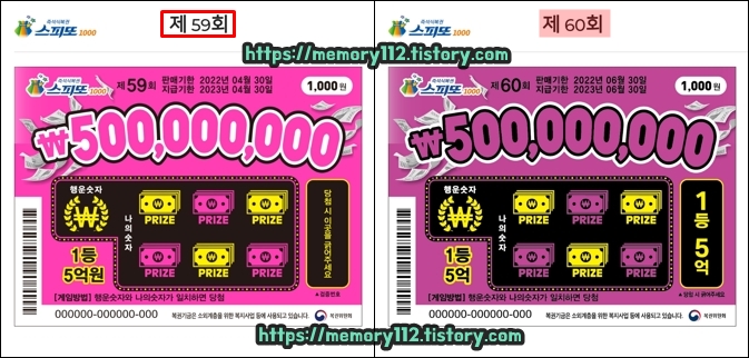 스피또1000 60회차 복권은 판매를 시작한 지 얼마 안 돼서 그런지 1등 5억 복권 9매, 2등 2천만원 복권 45매 최초 발매 수량 그대로 남아있는 상태입니다.