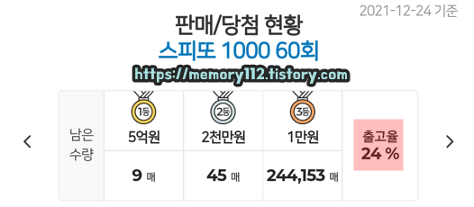 스피또1000 60회차 복권 출고율은 21년 12월 24일 기준으로 24%입니다. 스피또1000 60회차 복권 총발행량은 4,500만 매인데 이 중 24%에 해당하는 1,080만 매 정도가 전국 스피또 판매점에 뿌려졌다는 이야기입니다.