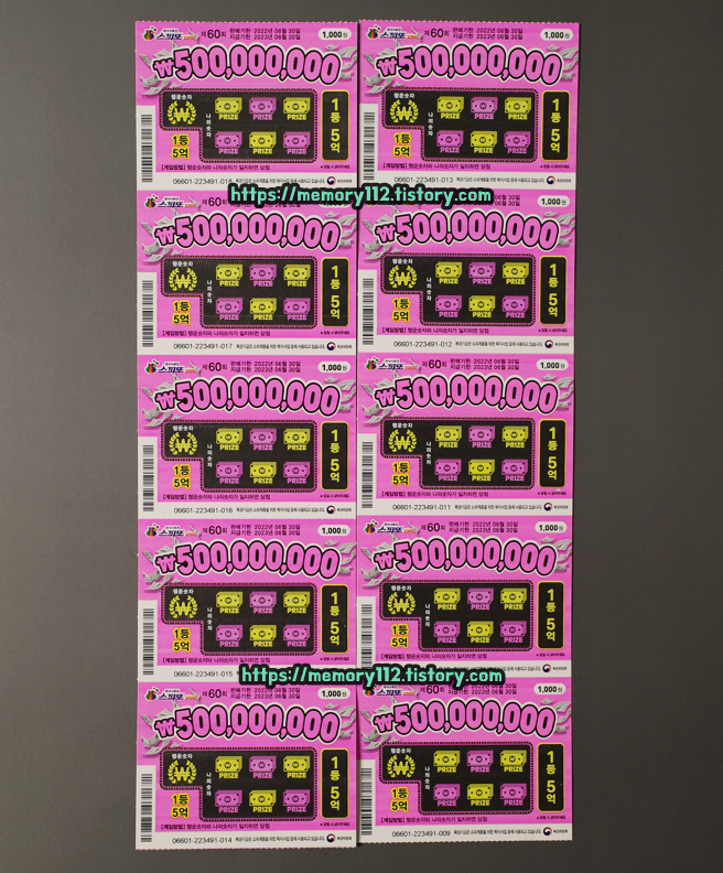 새로운 회차가 발매됐다는 소식을 접하고 구매한 '스피또1000 60회차'. 이번에도 마찬가지로 구매 수량은 총 10장입니다. (1개당 1천원이니까 총 1만원 듦)