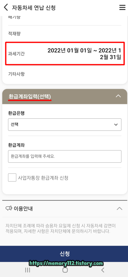 과세 기간을 확인한 후, 환급계좌 정보(선택사항)를 입력해줍니다. 참고로 저는 귀찮아서 환급 계좌 정보 입력 안 했습니다.