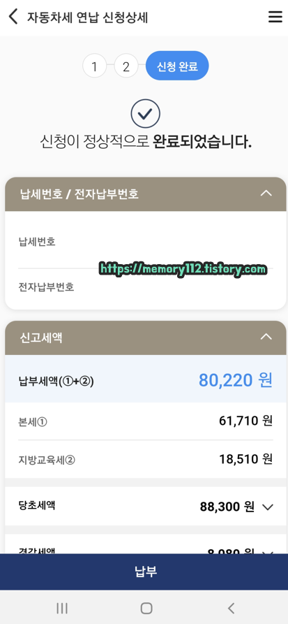 그러면 이렇게 자동차세 연납 신청이 완료됩니다. 이제 이 금액을 납부해주기만 하면 자동차세 연납 신청 완료입니다. 아래에 보이는 '납부 버튼'을 눌러줍니다.