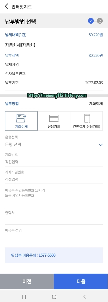 납부 방법을 선택한 후, 다음을 눌러줍니다. 자동차세 납부 가능 방법은 계좌이체, 신용카드, 간편결제(신용카드)입니다.