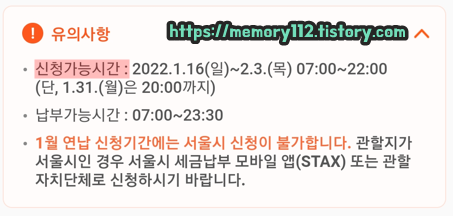 연납 신청 가능 시간은 07시부터 22시까지입니다. (단, 01월 31일 월요일은 20시까지 가능)
