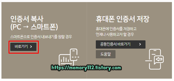 "인증서 복사(PC > 스마트폰)" 아래에 보이는 '바로가기'를 눌러줍니다.