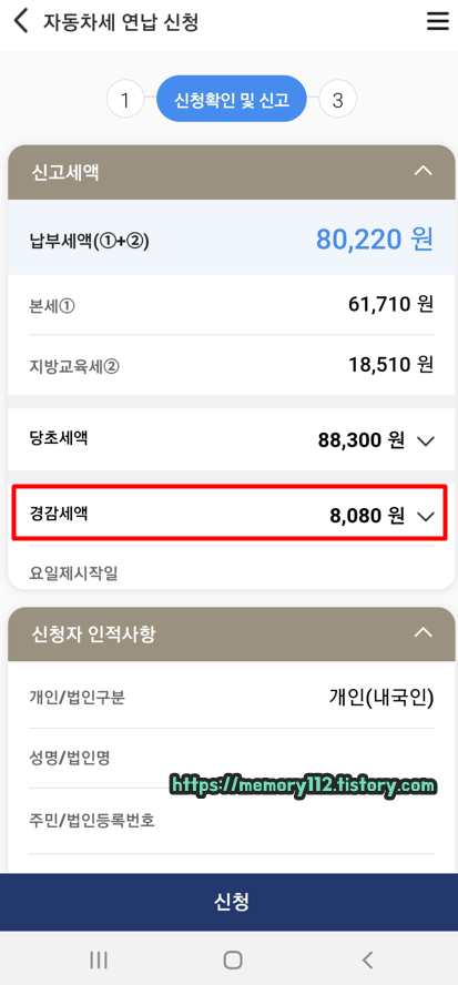 경감세액(할인금액)을 확인한 후, 아래에 보이는 신청 버튼을 눌러줍니다.