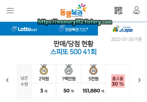 (22년 01월 20일 목요일 기준) 스피또500 41회차 출고율은 30%입니다. 해당 회차 복권 총발행량은 1,200만 매이니까 약 360만 매 정도가 전국 스피또 판매점에 뿌려졌다는 이야기입니다.