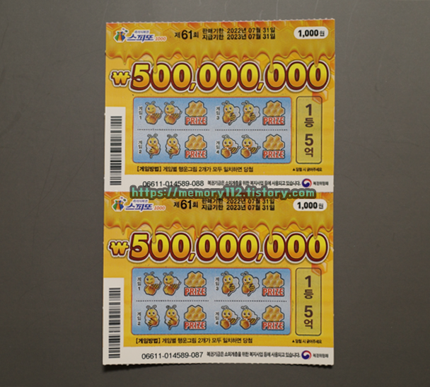 1등 5억 복권도 9장 중에 아직 3장이나 남아있는 상태이고, 어느덧 출고율도 100%에 가까워지고 있어서 구매한 '스피또1000 61회차'. 해당 회차 복권은 이번이 2번째 구매네요.