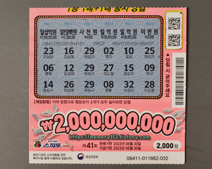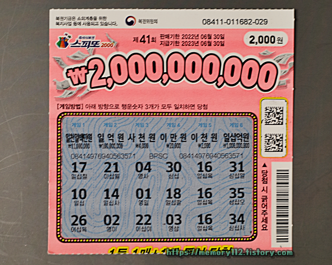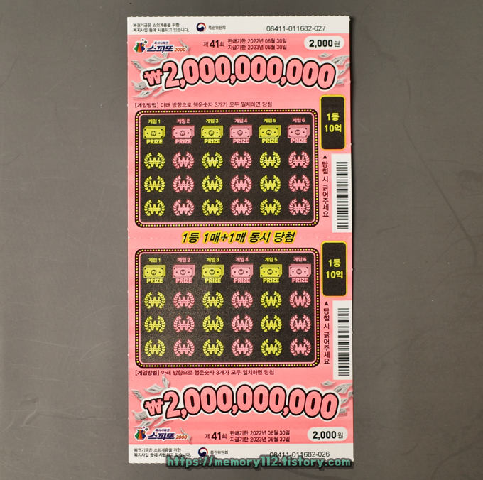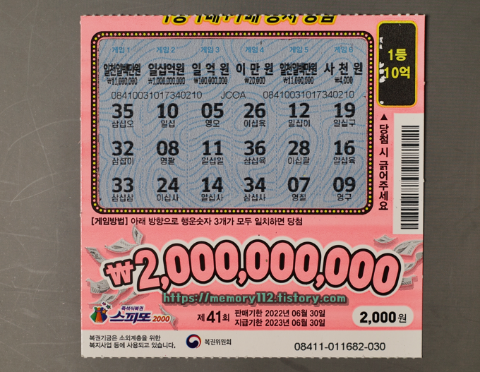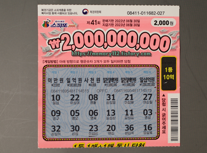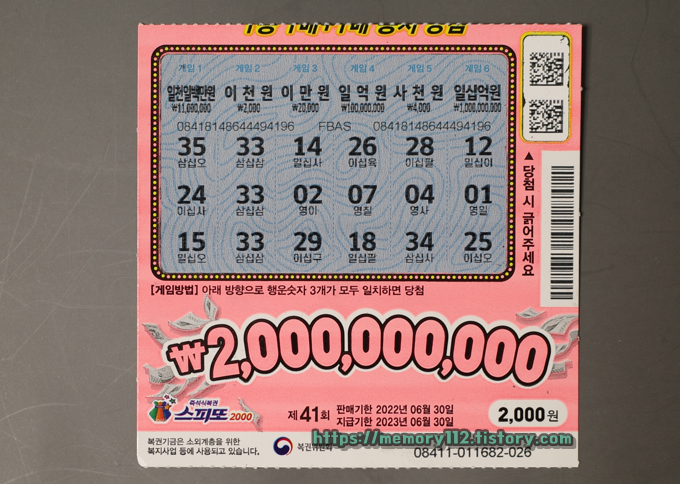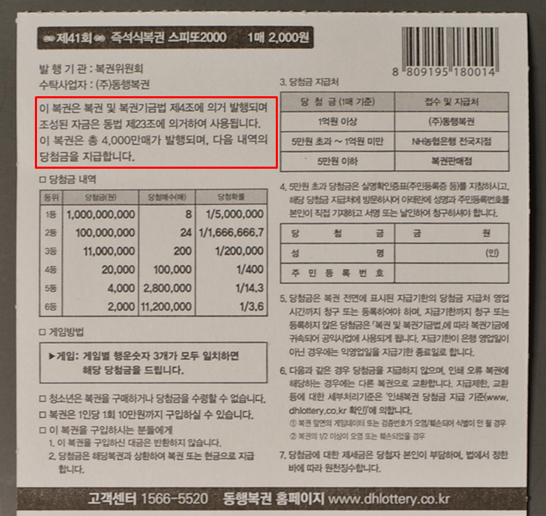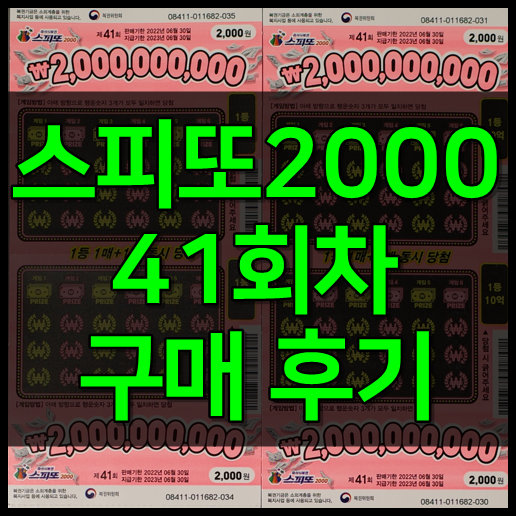 스피또2000 41회 복권은 총 4,000만 매가 발행되었으며, 22년 05월 01일 일요일 기준으로 출고율 100%이고, 1등 10억 복권 8장이 모두 나와 공식적으로 판매가 종료된 복권입니다. 다시 말해, 스피또2000 42회차 발매가 시작되었다는 뜻이죠.