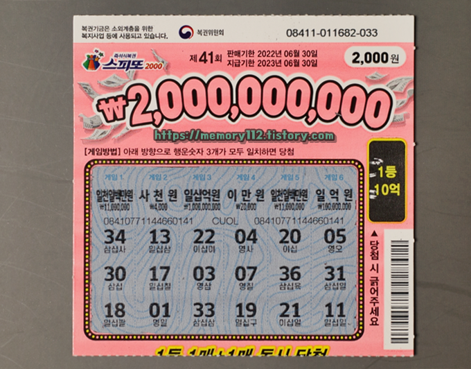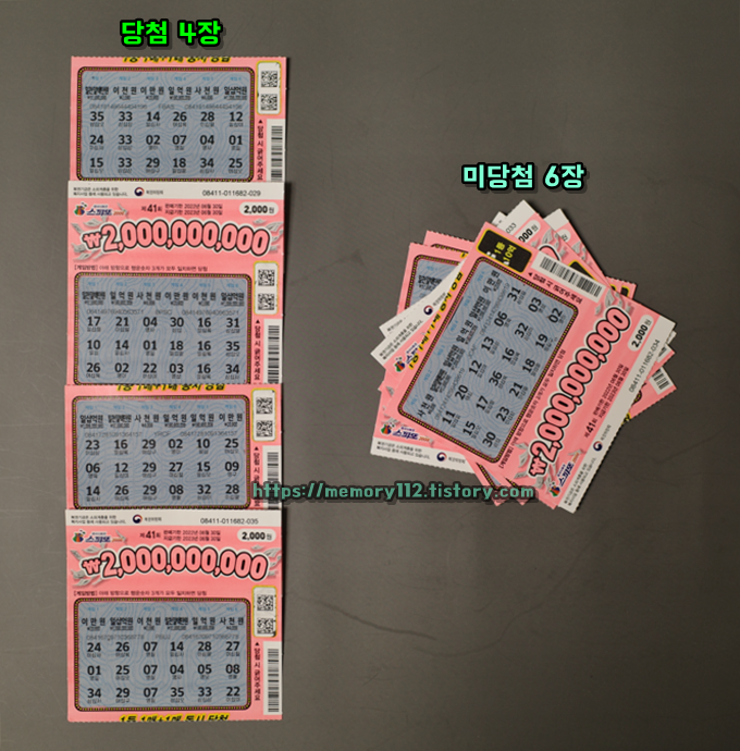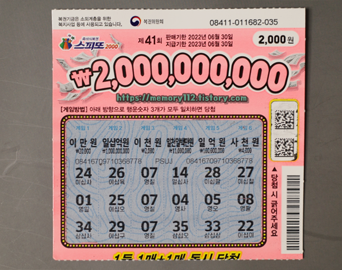 스피또2000 41회 1등 10억 마지막 당첨자는 22년 04월 19일 화요일에 나왔었네요. 오늘 05월 01일 일요일 기준으로 12일 전에 마지막 당첨자가 나온 것이네요.