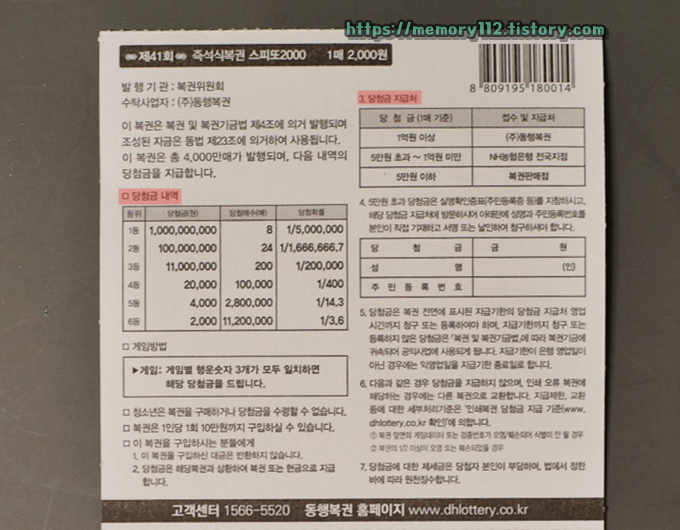 스피또2000 41회차 게임 방법은 아래 방향으로 행운 숫자 3개가 모두 일치하면 당첨이며, 총 6게임이 준비되어있습니다. 그럼 이제 본격적으로 복권을 긁어보도록 할까요?