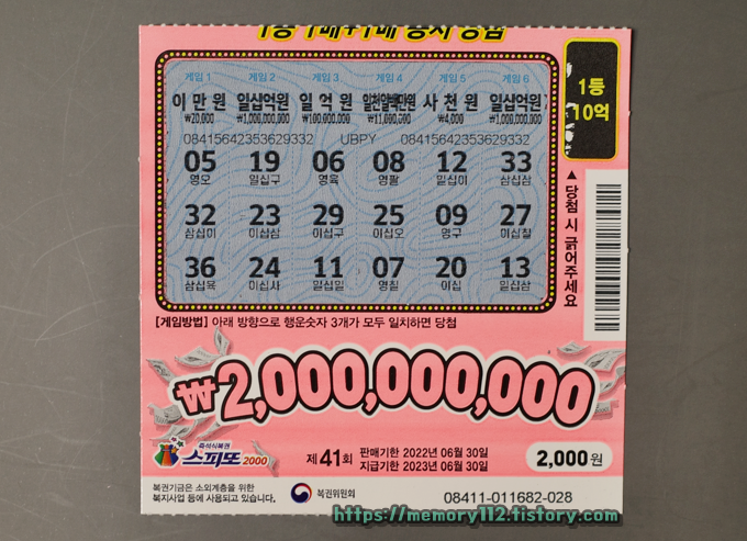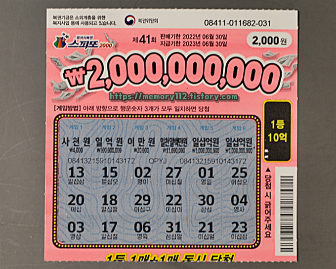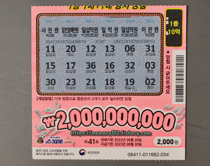 구매일은 좀 됐지만 1등 10억 복권이 모두 나온 상태에서 긁어보는 '스피또2000 41회차'. 구매 수량은 총 10장으로 복권 구매 비용으로 거금 20,000원이 지출되었습니다.