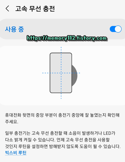 그렇다면 혹시 고속 무선 충전 기능이 꺼져있어서 그런 게 아닐까 해서 봤는데.. 이 기능도 문제없이 잘 켜져 있더라고요. 그리고 사진에 보이는 것처럼 충전기 중앙에 휴대폰을 다시 놓아봤는데도 충전은 안 되더라고요. 충전 자체가 아예 되지 않았어요.