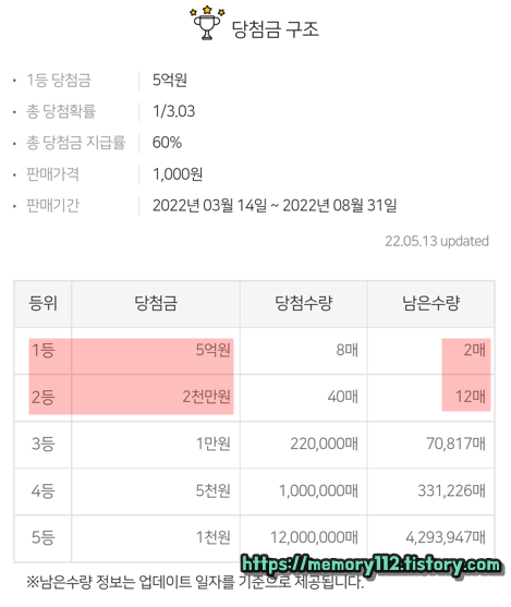 22년 05월 13일 금요일 기준으로 현재 남아있는 당첨 복권은 다음과 같습니다.