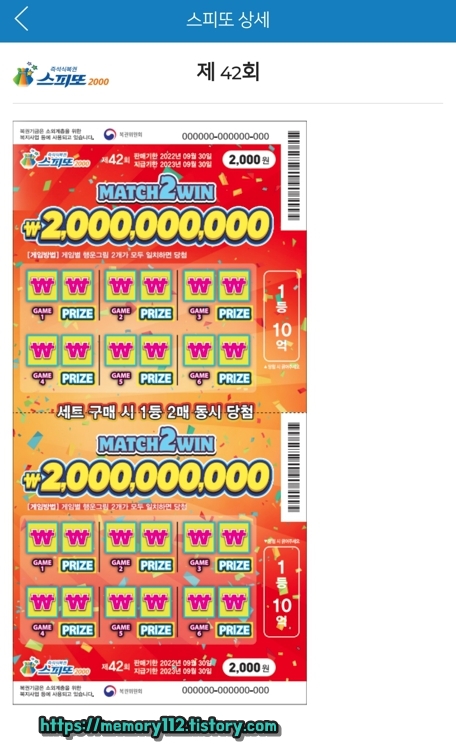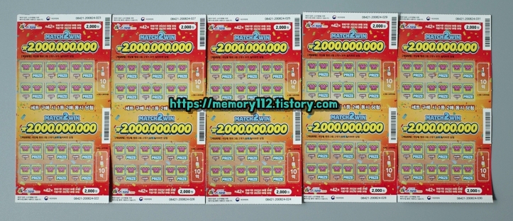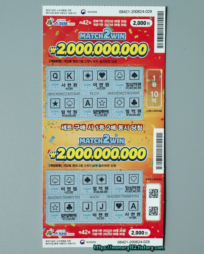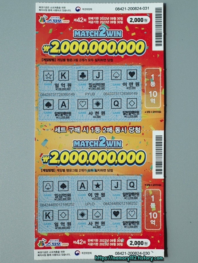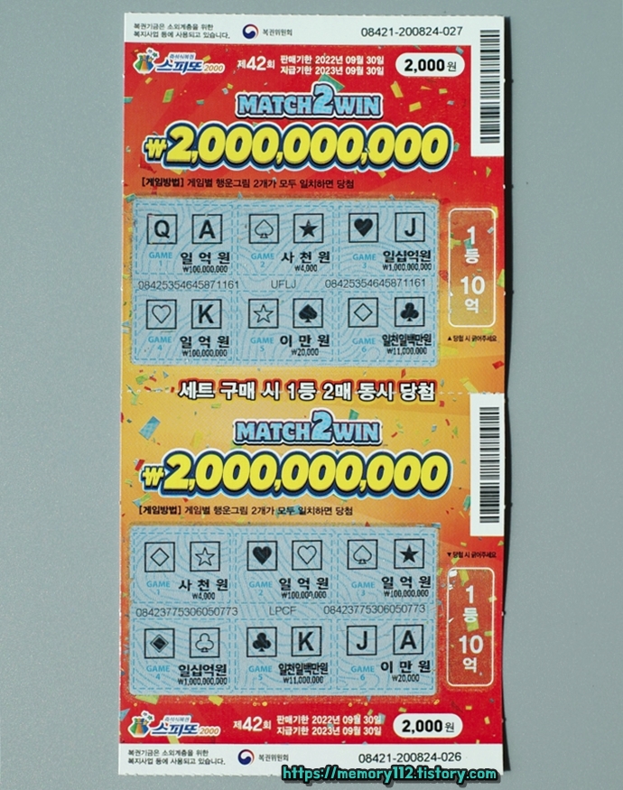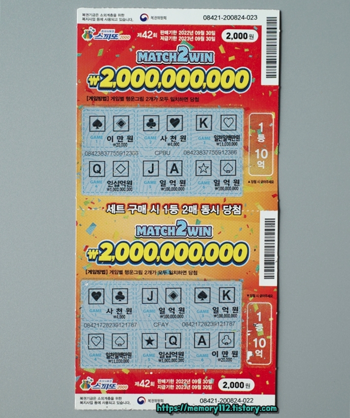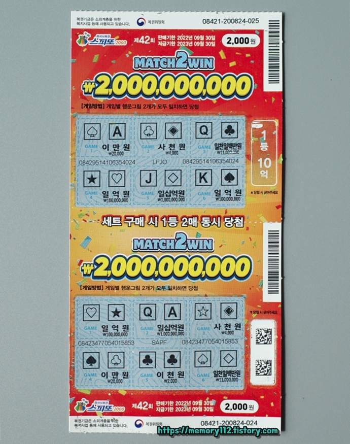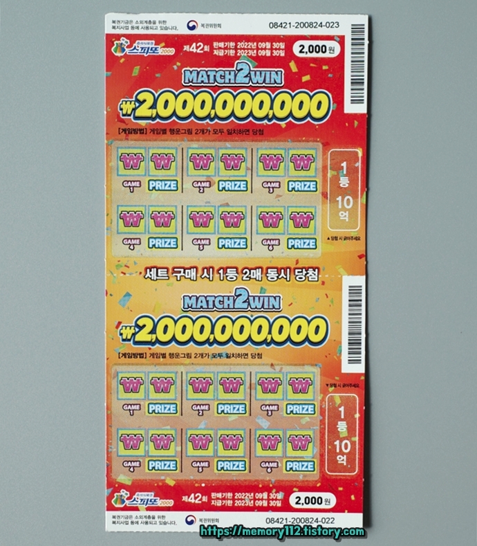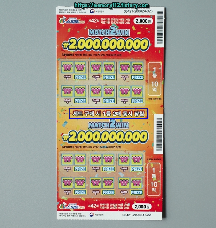 스피또2000은 스피또500 또는 1000과는 다르게 1등 10억 복권이 2장 연달아 발매됩니다. 사실상 스피또2000 1등 당첨금은 10억이 아닌 20억인 것이죠.