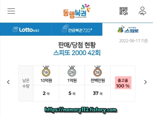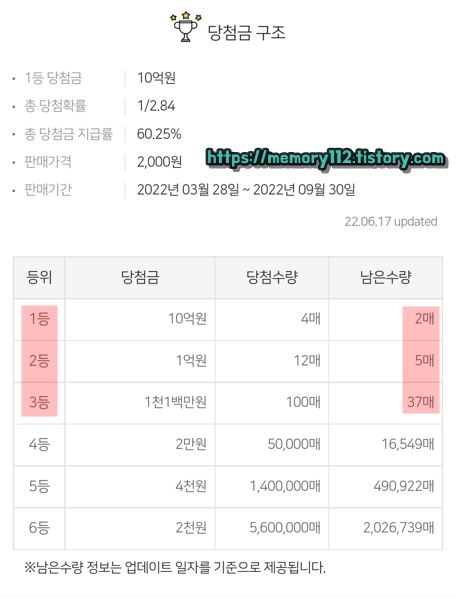 22년 06월 17일 금요일 기준 남은 당첨 복권은 1등 10억원 2매, 2등 1억원 5매, 3등 1천1백만원 37매입니다.