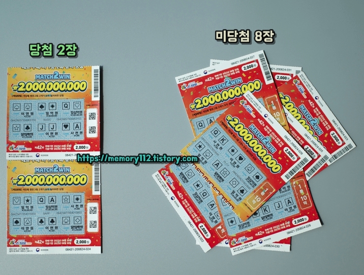 7~8번째 복권, 이번에는 일치하는 그림이 하나 보입니다..!! 그런데 당첨금은 아쉽게도 2천원이네요. (이거라도 어디야..)