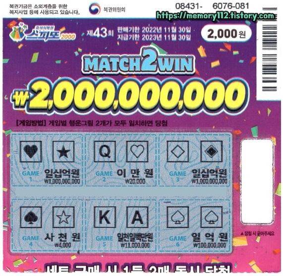2022년 05월 16일 월요일부터 판매가 시작된 스피또2000 43회차 복권 디자인입니다. 이번 회차 복권 디자인은 조금 화려하네요.