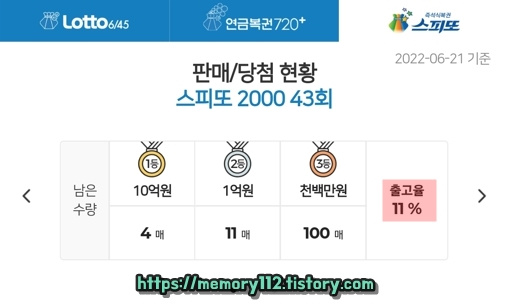 22년 06월 21일 수요일 기준, 스피또2000 43회차 남은 당첨 복권은 1등 10억 4매, 2등 1억 11매, 3등 1천1백만원 100매입니다. 현재 2등 1억 복권만 하나 나온 상태네요.