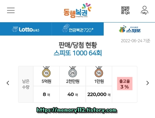 22년 06월 24일 금요일 기준으로 스피또1000 64회차 복권 출고율은 3%입니다. 스피또1000 64회차 복권 총발행량은 4,000만 매이며, 이 중 3%에 해당하는 120만 매가 전국 스피또 복권 판매점에 뿌려졌다는 이야기입니다.