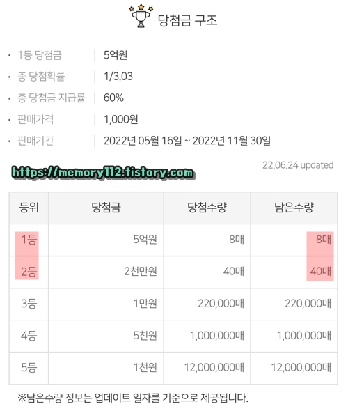 판매가 시작된 지 아직 한 달 정도밖에 안돼서 그런지 아직까지 1등 5억(총 8매)과 2등 2천만원(총 40매) 당첨자는 나오지 않은 상태입니다.