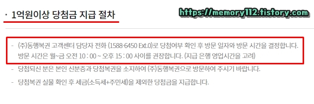 스피또 복권 당첨금이 1억원 이상이라면 (주)동행복권 고객센터에 전화해 전화로 당첨 여부를 확인한 후, 방문 일자와 방문 시간을 미리 결정하는 것이 좋습니다. (방문 후 실물 복권 당첨 확인 및 당첨 소감 인터뷰 절차가 있을 수 있음)