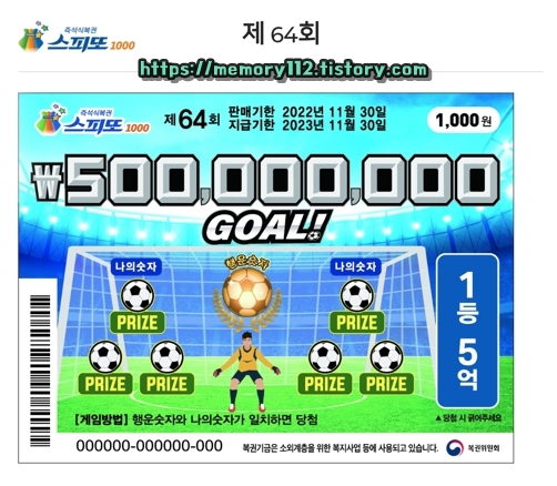 22년 05월 16일 월요일부터 판매가 시작된 스피또1000 64회차 복권 디자인입니다. 이번 복권 디자인은 축구 컨셉이네요.