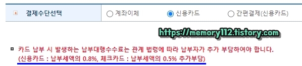 참고로 신용카드, 체크카드, 간편결제 이용 시에는 납부대행 수수료가 있습니다. (신용카드 0.8%, 체크카드 0.5%) 그리고 납부대행 수수료는 결제 전 미리 확인할 수 있습니다.