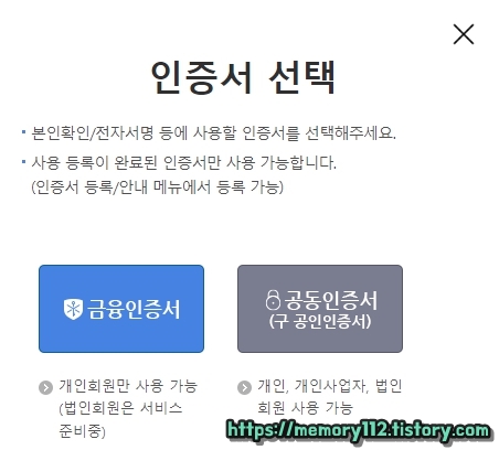 본인 확인 및 전자 서명을 위해 금융인증서 또는 공동인증서(구 공인인증서) 인증을 해줍니다.