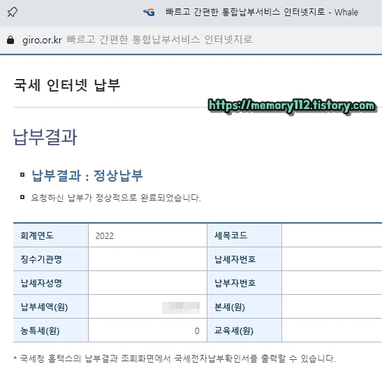 인증서 인증을 완료해주면 이렇게 바로 '세금 납부 결과'를 확인할 수 있습니다. 위와 같이 세금 납부 결과가 '정상납부'라고 표시된다면 세금 납부가 완료된 것입니다.