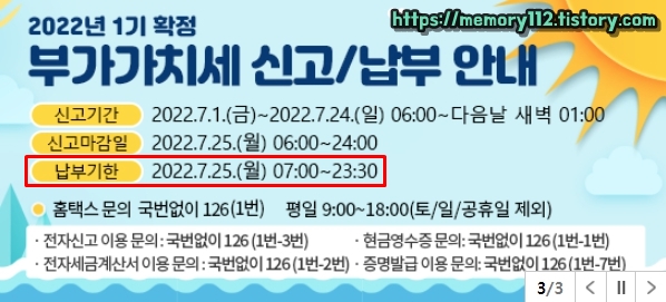 22년 1기 확정 부가가치세 신고 기간은 22년 07월 01일 금요일부터 07월 24일이며, 신고 마감일은 7월 25일 월요일이다. 그리고 부가가치세 납부 마감일은 22년 07월 25일 월요일 23시 30분이다.