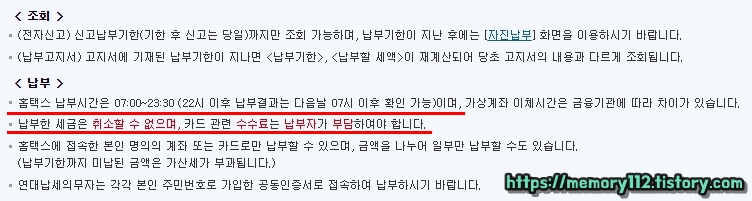 부가가치세 납부 가능 시간은 07시부터 23시 30분이며, 납부한 세금은 취소할 수 없다. 그리고 카드 납부 시 발생하는 납부대행수수료는 무조건 납부자가 부담해야 한다.