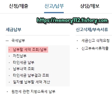 로그인 후, 신고/납부 메뉴에 있는 '납부할 세액 조회/납부'를 눌러줍니다.