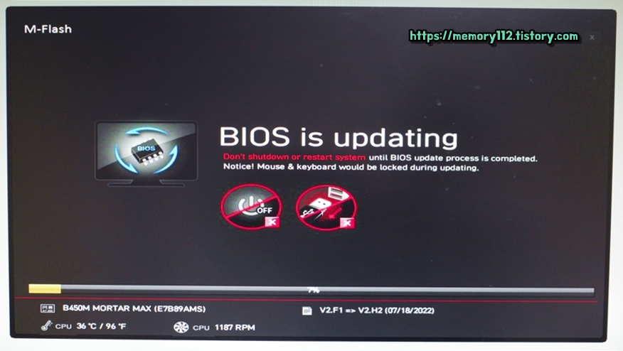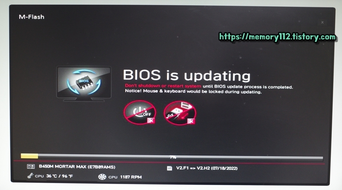 파일 선택을 완료하면, 이렇게 바이오스 업데이트가 바로 진행됩니다. 여기서 우리가 주의해야 할 점은 바이오스 업데이트 중 전원을 끄거나 USB를 빼지 말아야 한다는 것입니다. 잘못하면 메인보드가 벽돌이 되어 제조사에 A/S 요청을 해야 할 수도 있기 때문입니다.