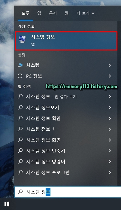 일단 먼저 시작 메뉴를 클릭한 후, "시스템 정보"를 입력해줍니다. 그리고 검색 결과에 나오는 앱을 클릭해 실행해줍니다.