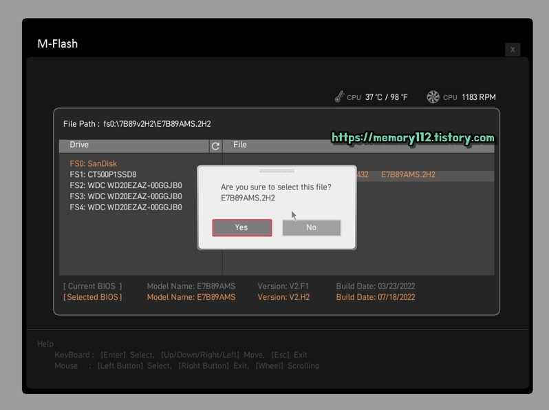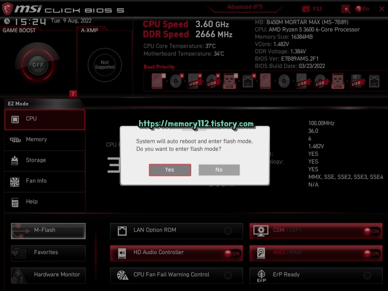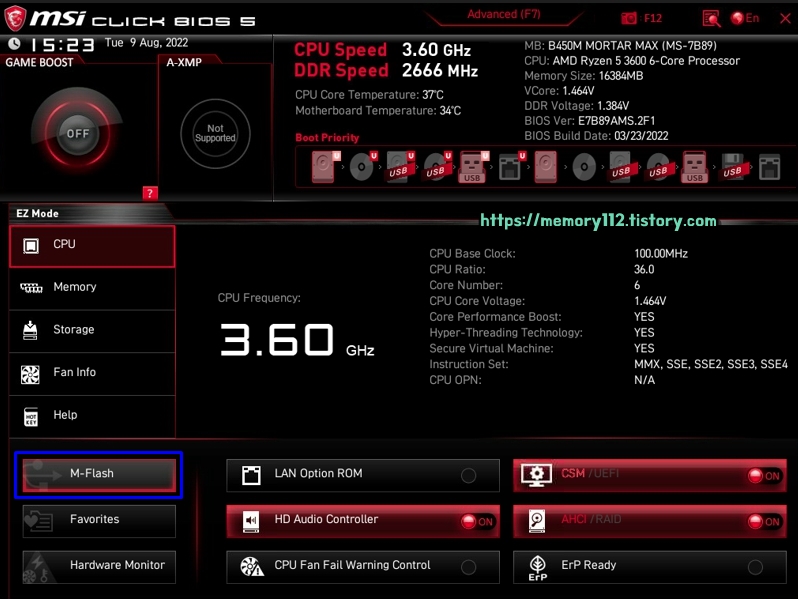 바이오스 화면 진입 후, 좌측 하단에 보이는 "M-Flash"를 눌러줍니다.