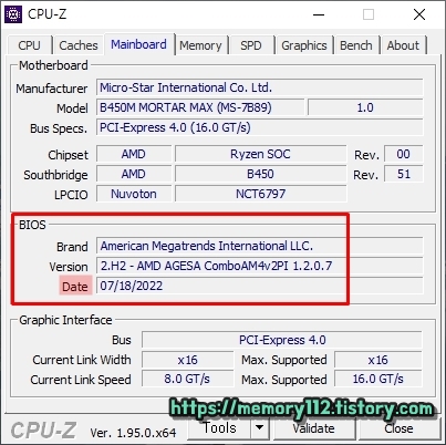 부팅 완료 이후에는 "CPU-Z"라는 프로그램을 통해 바이오스 업데이트 완료 여부를 확인할 수 있습니다. Mainboard 탭에 있는 "BIOS > Date"를 통해 말이죠. (22년 07월 18일에 공개된 바이오스 드라이버를 사용 중..)