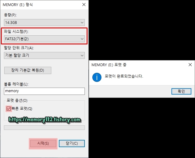 파일 시스템은 "FAT32"로 선택해주고, 포맷 옵션에 있는 "빠른 포맷(Q)"를 선택해줍니다. 모두 선택했다면, 아래에 보이는 "시작(S)"을 눌러줍니다. 위와 같이 "포맷이 완료되었습니다."라는 문구가 뜬다면 다음으로 넘어가 줍니다.