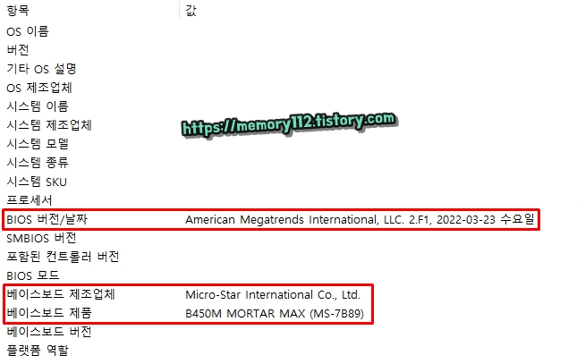 여기서 바이오스 버전과 날짜 그리고 메인보드 제조사와 모델명을 확인할 수 있습니다. 보니까 저는 바이오스 버전이 22년 03월 23일 수요일에 나온 버전이 설치돼있는 상태고, 메인보드 제조업체는 MSI(Micro-Star International)이네요. 그리고 메인보드 모델명은 "B450M MORTAR MAX"네요. 여기 나온 정보를 토대로 최신 버전의 바이오스 드라이버를 다운로드해주면 됩니다.