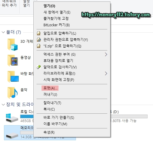 바이오스 업데이트를 문제없이 제대로 해주기 위해서 USB 포맷을 해줍니다. USB 드라이브 > 마우스 우클릭 > "포맷(A)..."을 눌러주세요.
