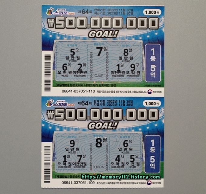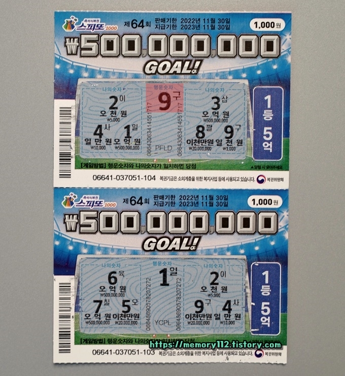 22년 05월 16일 월요일부터 판매가 시작된 스피또1000 64회차 복권이 어느덧 출고율 100%에 달성됐다는 소식을 듣고 구매한 "스피또1000 64회차 복권". 이번에도 10장을 구매해봤습니다.