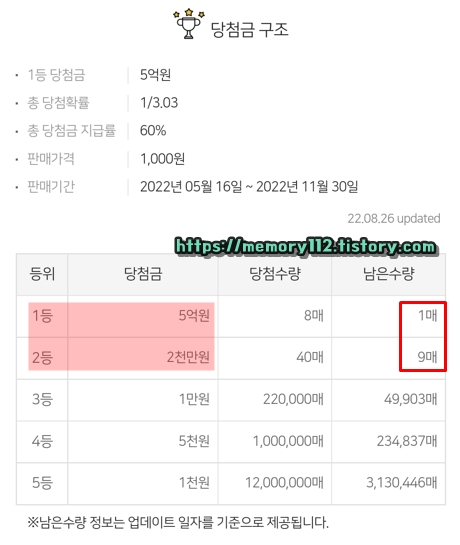 스피또1000 64회차 1등 5억 복권은 현재 1매 남아있는 상태고, 2등 2천만원 복권은 9매 남은 상태입니다.