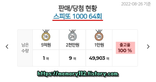 스피또1000 64회차 복권은 총 4,000만매가 발행되었으며, 현재 1등 5억 복권이 한 장 남아있는 상태입니다. (22년 08월 26일 금요일 기준)
