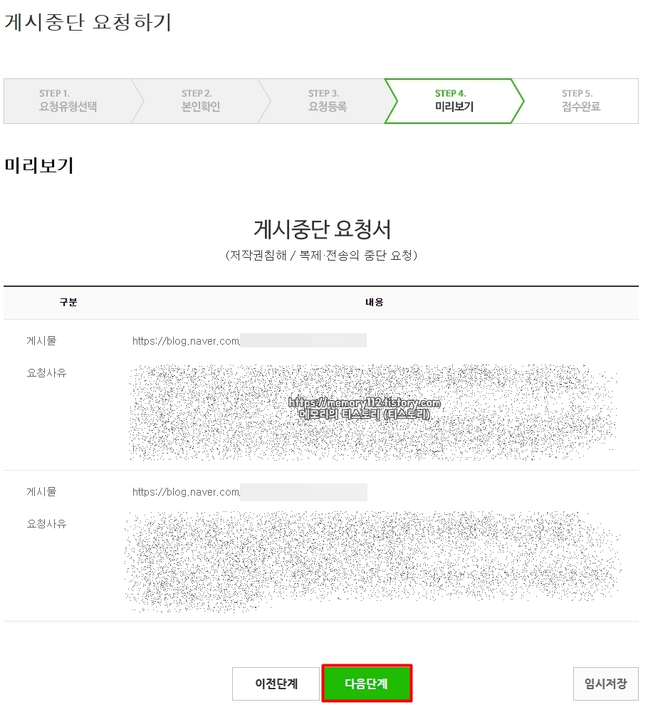 게시중단 요청서 미리보기 단계입니다. 입력했던 내용들을 확인한 후, 이상이 없다면 아래에 보이는 다음단계 버튼을 눌러줍니다.