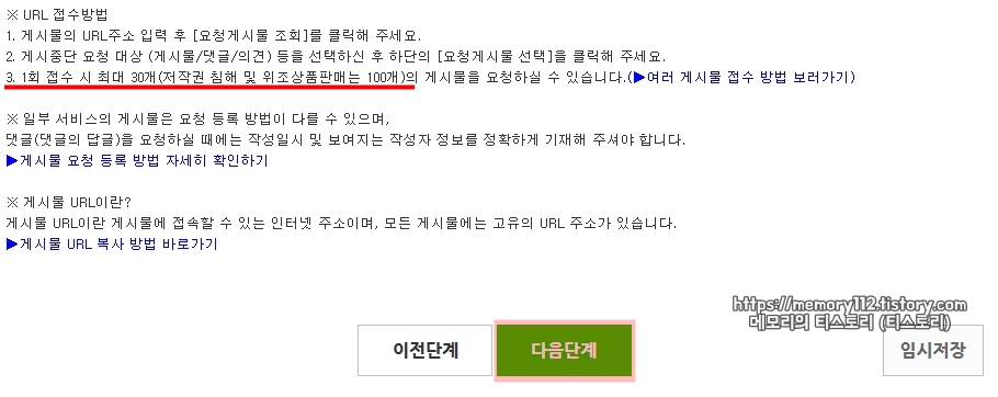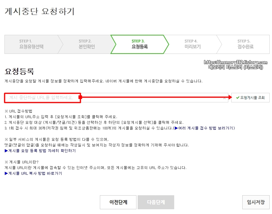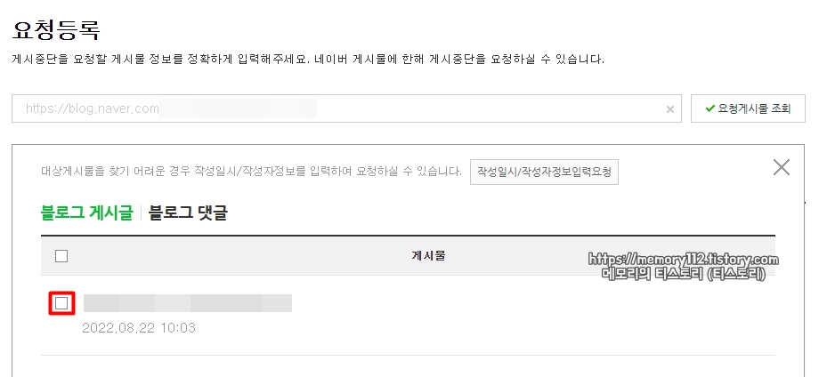 다음으로 요청등록 단계입니다. 여기서는 일단 게시 중단하고 싶은 게시물 주소를 입력한 후, 우측에 보이는 "요청게시물 조회"를 눌러줍니다.