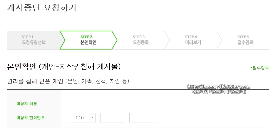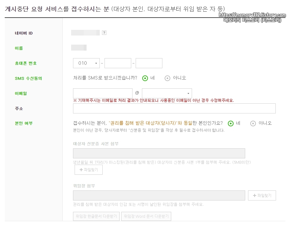 게시 중단 요청을 하는 사람의 정보를 입력해줍니다. 여기서 입력해야 할 정보는 휴대폰 번호, SMS 수신동의, 이메일, 본인 여부입니다.