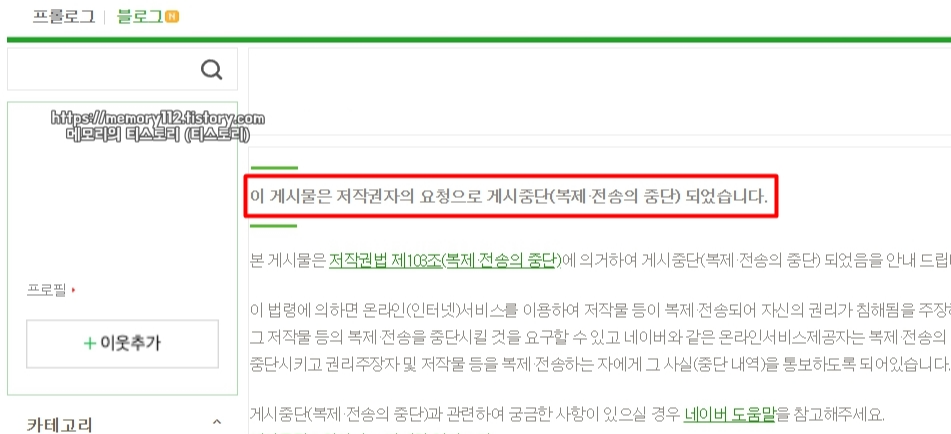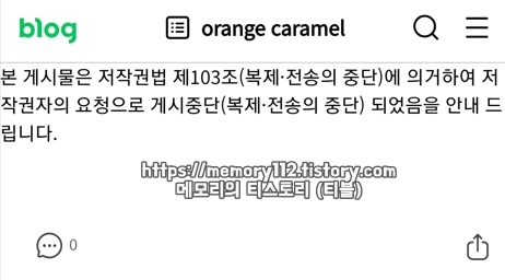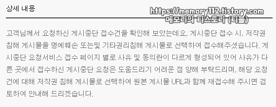 게시 중단 요청이 승인된 게시물은 제목이 이렇게 "이 게시물은 저작권자의 요청으로 게시중단(복제·전송의 중단) 되었습니다."로 바뀌게 됩니다.
